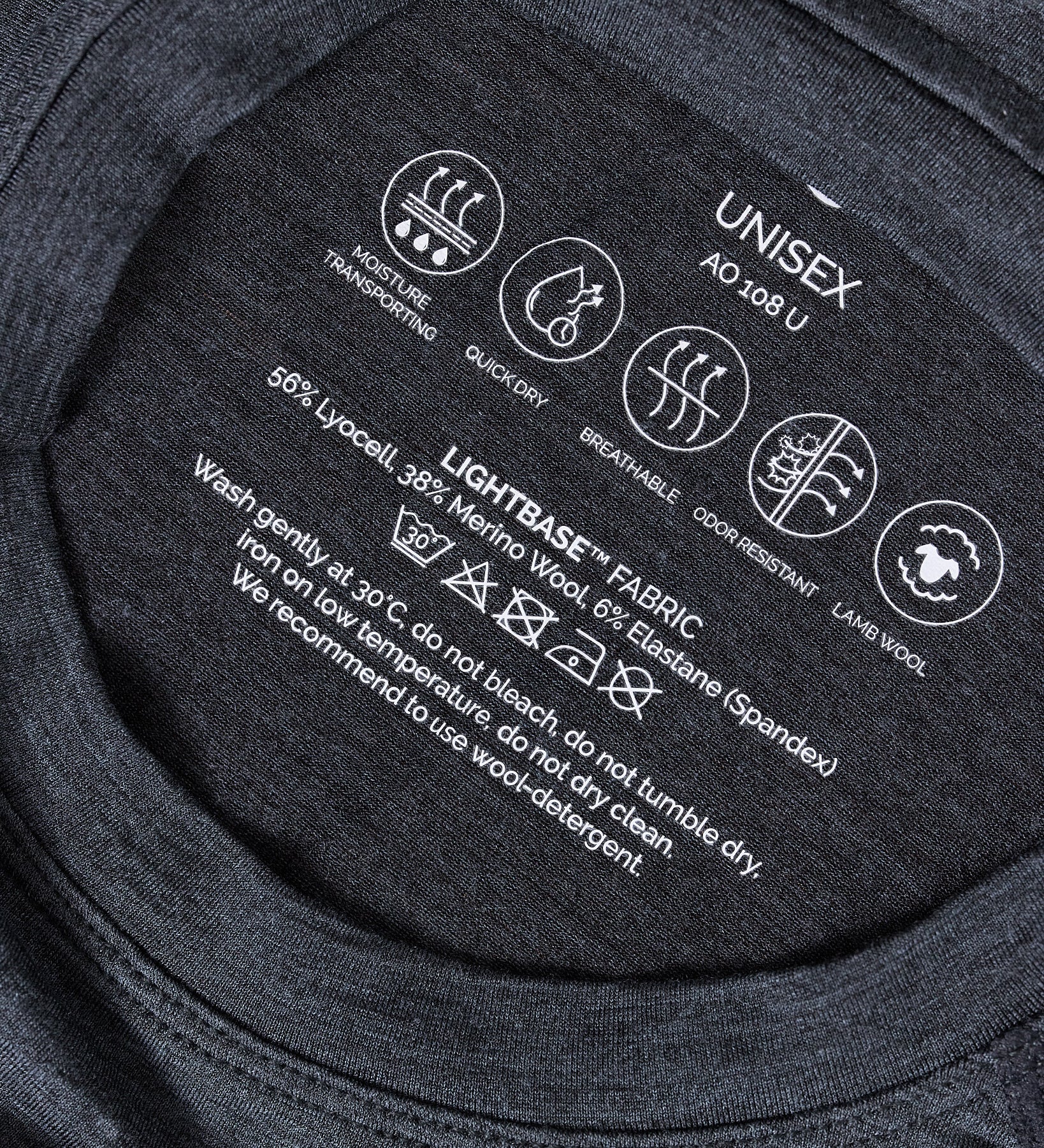 - Lightbase™: 56% Tencel®, 38% Merino Wool, 6% Elastane, 160 gsm